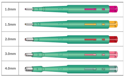 截取细微样本的得力助手!光滑锋利的刀头,精巧的样本弹射,以及拿捏部位的防滑设计等均独具匠心!每种尺寸清晰标于杆上,不同颜色的按钮便于辨识。